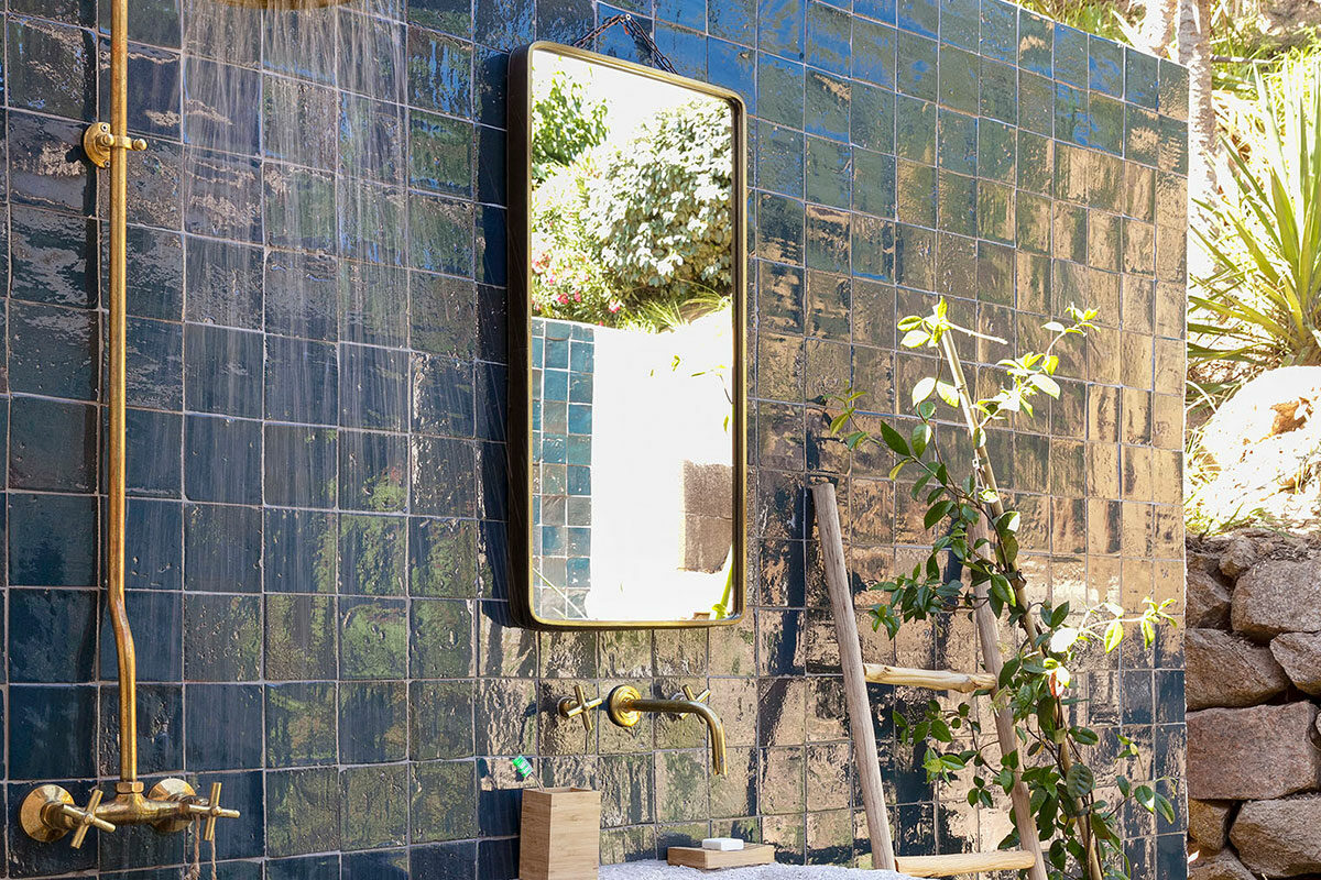A l’extérieur, salle d’eau d’été avec douche et vasque de pierre taillée.