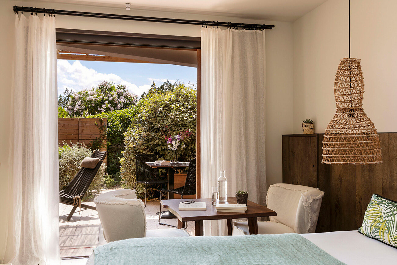 Une décoration douce et chaleureuse, des matériaux nobles et un lit accueillant, on s’y sent tout de suite bien. La superficie privative de cette chambre est multipliée par deux avec la douche façon balinaise en extérieure, la terrasse en bois exotique ombragée et son jardin intimiste.