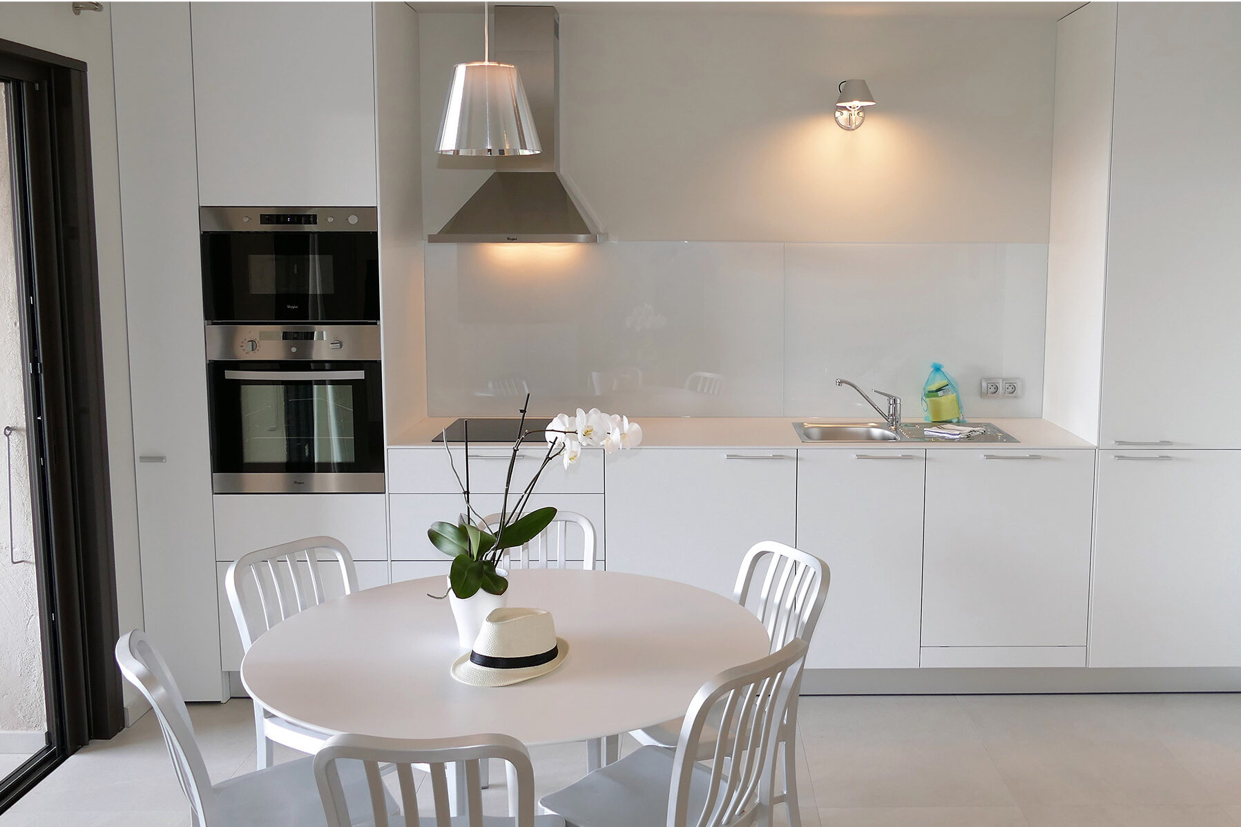 Cuisine américaine entièrement équipée avec accès direct sur la terrasse : vaisselle, ustensiles de cuisine, four, four micro-ondes, plaque de cuisson, hotte aspirante, réfrigérateur, congélateur, lave-vaisselle, lave-linge, cafetière Nespresso, bouilloire, grille-pain, équipement pour le ménage (balai, aspirateur), table à repasser, fer à repasser, 1 torchon et un pack entretien de 1ère nécessité (pastilles pour lave-linge, lave-vaisselle, éponge, sac poubelle, 1 rouleau de papier toilette).