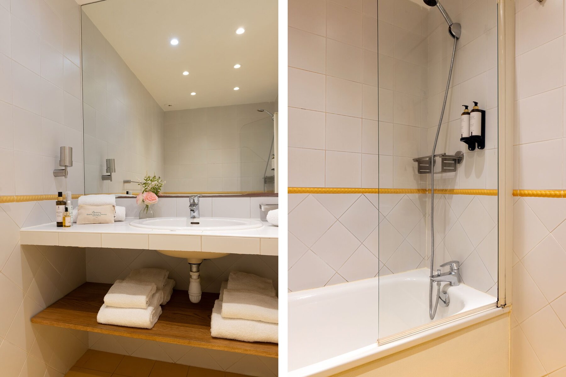 Salle d’eau avec douche (ou baignoire) & vasque, wc séparés, sèche serviettes, sèche-cheveux.